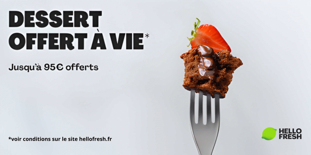 Profitez de recettes variées prêtes en quelques minutes et savourez un dessert gratuit à chaque livraison, à vie ! Une offre idéale pour découvrir HelloFresh et se régaler semaine après semaine.